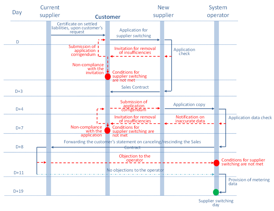 In line with the Law, all final electricity customers are entitled to free selection of supplier. Once a final customer selects a new supplier and contracts full supply with the supplier, the customer submits an application for the switch of the supplier in line with these Rules. All further activities in line with this application are taken by the new supplier and the system operator. Therfore, the whole procedure is limited to 21 days since the day a valid application is submitted (the final customer who will have its supply stopped with the current supplier pays attention to the time when an application for the supplier switch can be filed at the latest). When the system operator establishes during the supplier switching procedurethat the final customer complies with the conditions for the supplier switch (e.g. the customer has settled all due liabilities towards the current supplier and complies with other prescribed conditions), the system operator informs on this all participants of the procedure on the 21st day since the submission of the application at the latest.